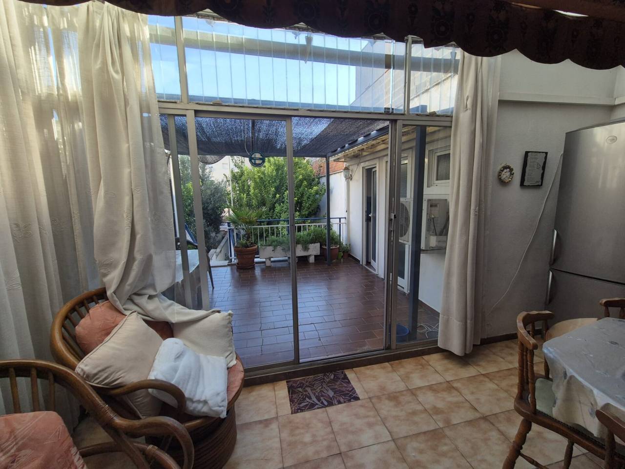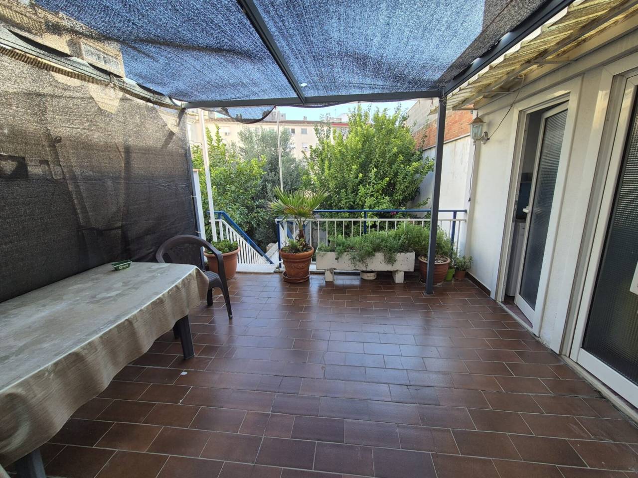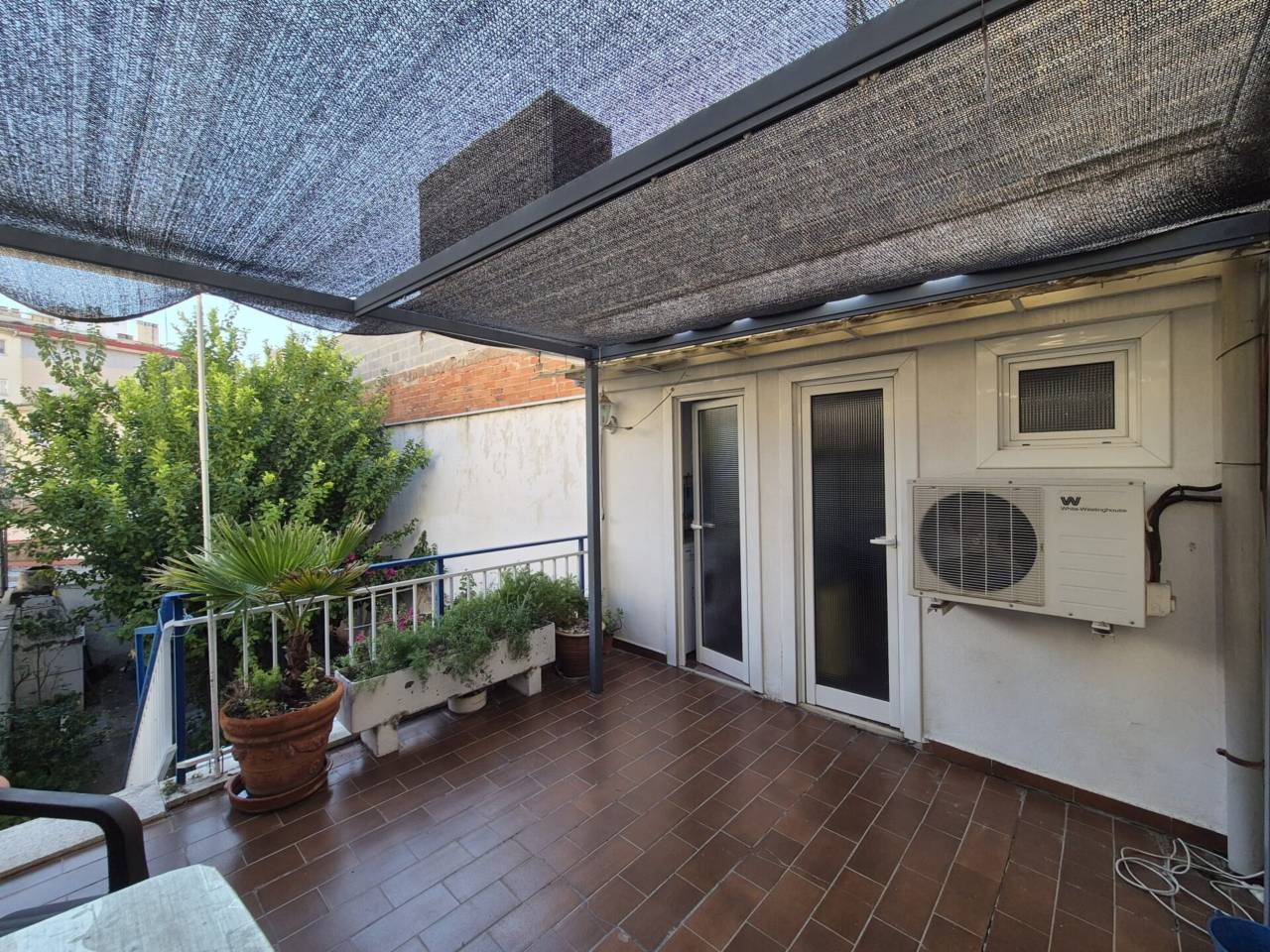 Con salón-comedor exterior a terraza, cocina independiente, lavadero, 2 baños, y 3 habitaciones dobles. Desde la terraza se accede a una planta inferior donde encontramos un patio de 80 m² con un porche y una habitación.